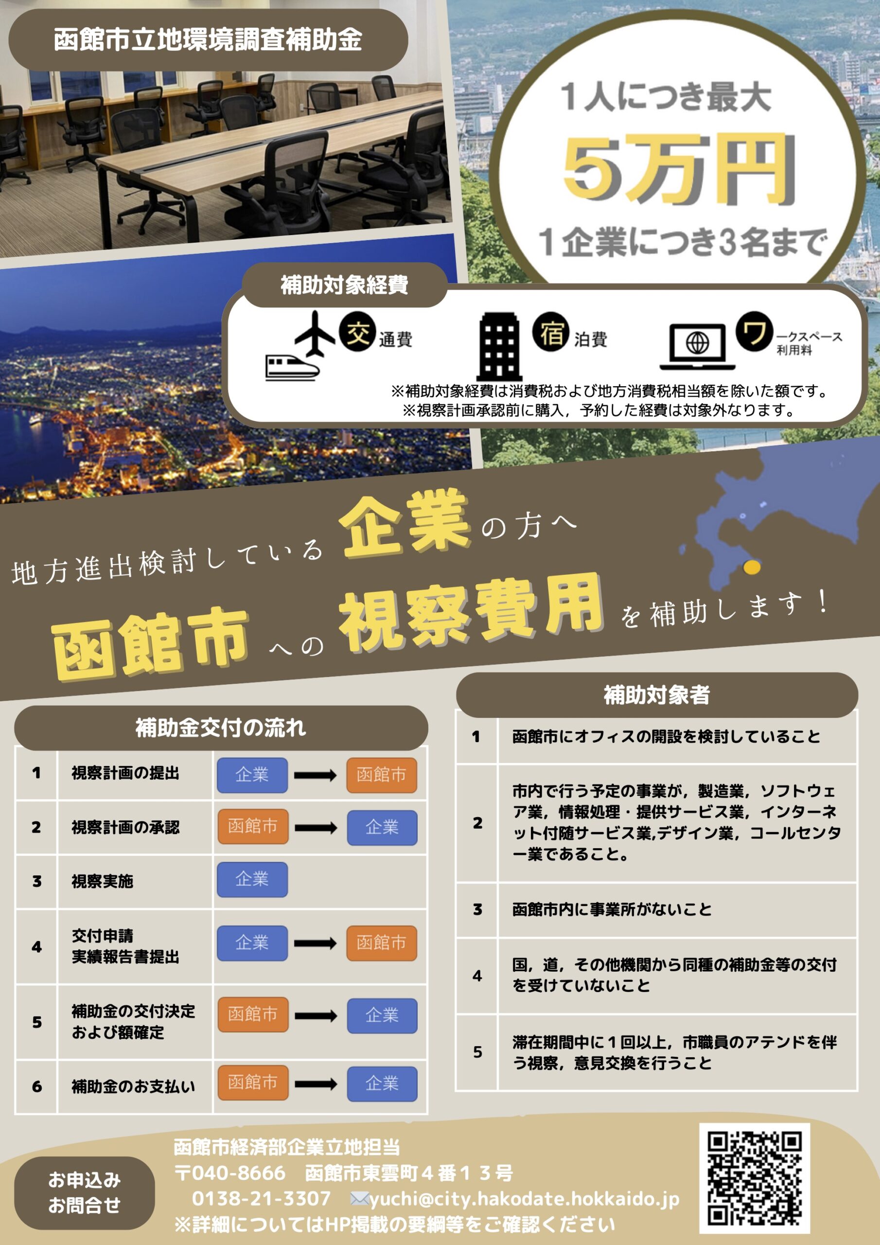 本社機能の移転や地方の拠点となるサテライトオフィス等の開設を検討する市外事業者が,函館市への視察を行う費用の一部を補助することにより,将来的な市内への立地促進を図り,もって市内における産業の振興および雇用機会の拡大に寄与することを目的としています。